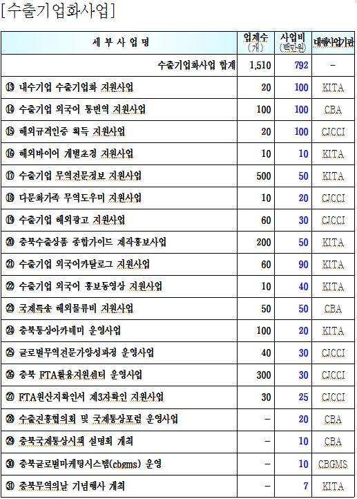 또한, 충북도는 오는 1월 29일에 국제통상시책설명회를 개최하여 금년도 사업계획을 도내 수출유관기관과 공동으로 도내 기업들에게 안내·홍보할 예정이다.