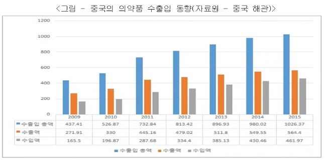 2015년 중국 의약품 수입은 462억 달러로 전년대비 7.3%나 성장했다. 수출입 시장 전체로도 지속적인 증가세를 보여 4.7% 증가한 1,026억 달러를 기록했다