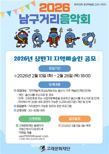 [페어뉴스]= (재)고래문화재단(이사장 서동욱)은 지역 예술인의 활동 무대를 넓히고 시민들이 일상 속에서 자연스럽게 문화를 즐길 수 있도록 '2026년 남구 거리음악회 지역예술인 지원사업'상반기 공모를 실시한다.