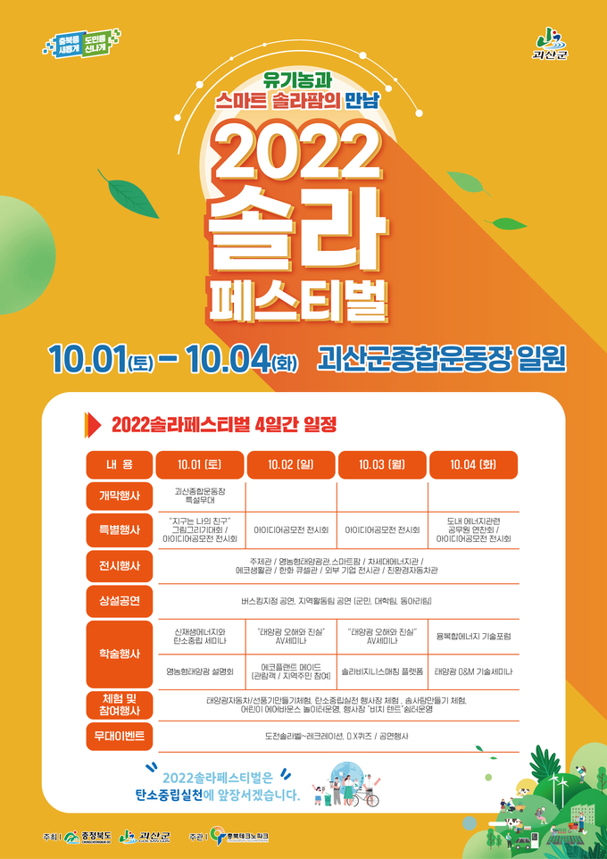 한편 솔라페스티벌 행사가 개최되는 기간에 2022 괴산세계유기농산업엑스포가 9.30~10.16일간 병행 개최되어 유기농산업에 대한 전주기를 손쉽게 볼 수 있을 뿐 만 아니라 솔라페스티벌 행사를 통해 에너지산업도 볼 수 있어 일석이조의 효과를 얻을 수 있다.