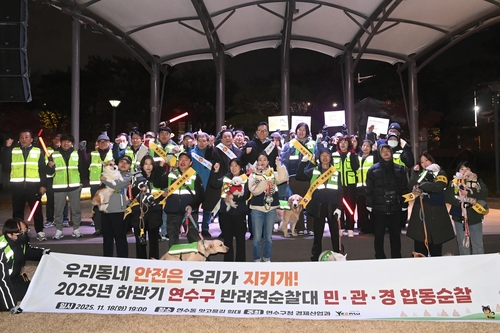 [페어뉴스]= 연수구(구청장 이재호)는 지난 18일 반려견 순찰대(일명 연수지킴댕댕이), 연수2동·동춘3동 자율방범대, 인천경찰청 기동순찰대 등 50여 명이 참여한 '민·관·경 야간 합동 순찰'을 진행했다.