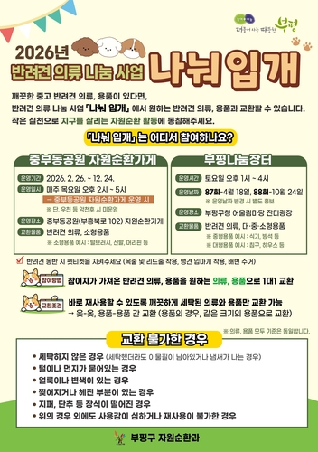 '나눠 입개'는 구청 어울림 마당에서 상·하반기(4월·10월)에 열리는 부평 나눔장터에서도 운영된다. 의류와 소형 용품은 물론 중형·대형 용품도 함께 비치될 예정이며, 같은 크기의 용품끼리 교환할 수 있다.