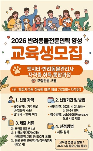 [페어뉴스]= 광주광역시(시장 강기정)는 반려동물 산업 성장에 대응하고 전문역량을 갖춘 인재 양성을 위한 '2026년 반려동물 전문인력 양성교육'을 실시한다.