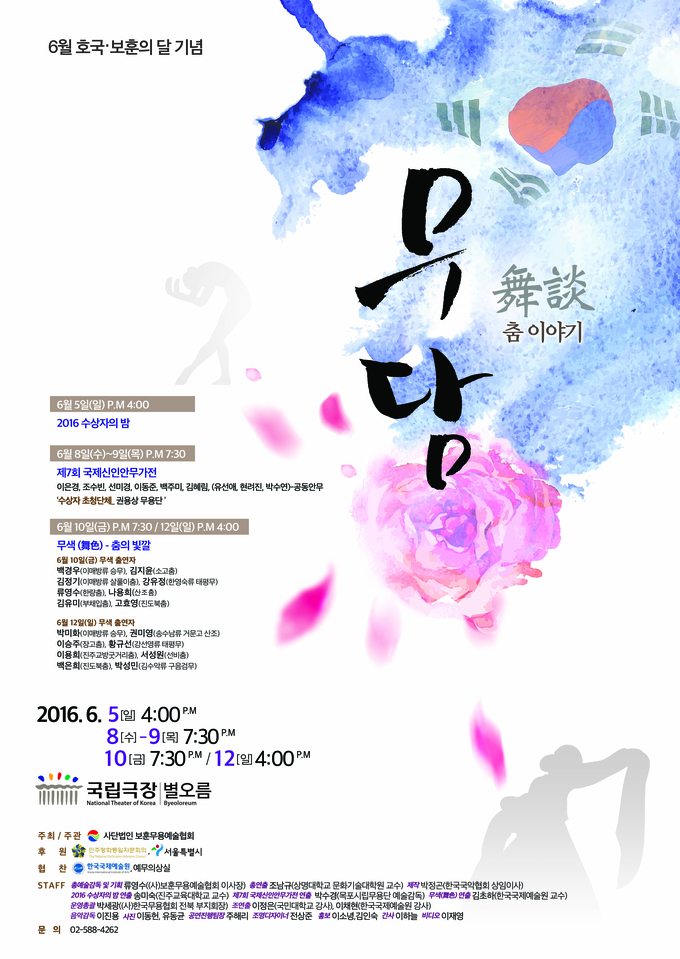 [페어뉴스]= 사)보훈무용예술협회(이사장 류영수)가 주최하는 6월 호국`보훈의 달 기념 ‘무담(舞談)-춤 이야기’ 행사가 6월 5일(일)부터 12일(일)까지 국립극장 별오름에서 열린다.